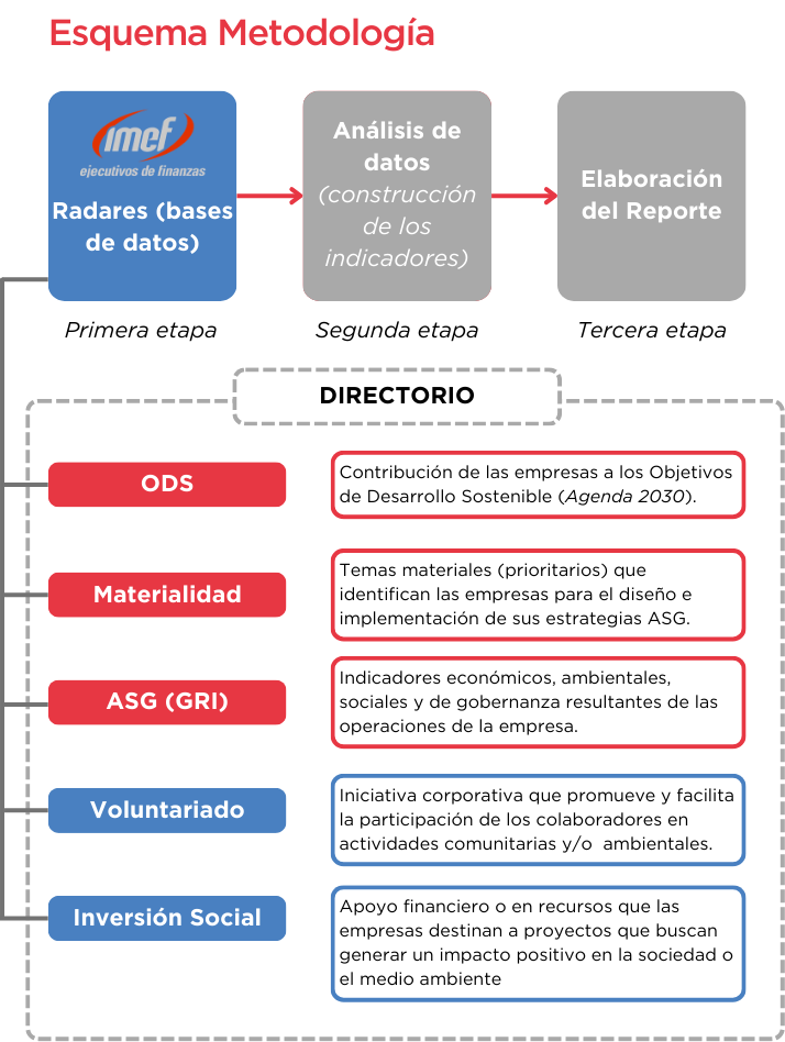 Sistematización de información pública reportada por las empresas en cinco enfoques: ODS, Materialidad, ASG (GRI), Voluntariado Corporativo e Inversión Social.
